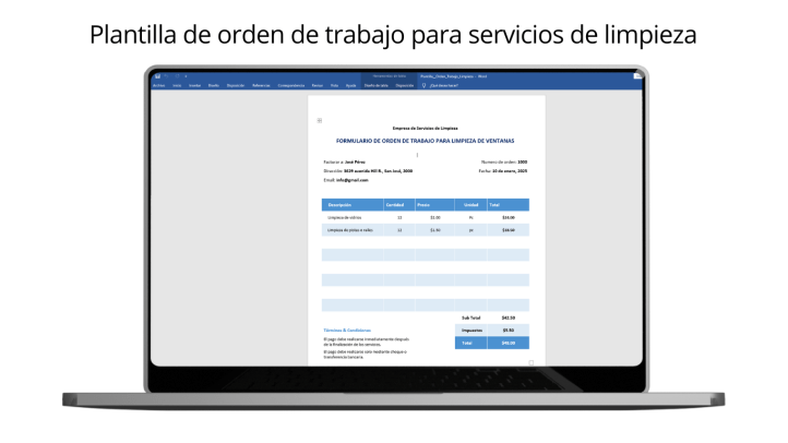 ¡Optimiza tus operaciones de servicios de limpieza con nuestra Plantilla de Orden de Trabajo! Diseñada en Microsoft Word, esta plantilla te permitirá administrar tus servicios de manera eficiente, mantener un registro organizado de tus clientes y garantizar una facturación precisa. Con características fáciles de usar y un diseño profesional, esta plantilla es ideal para negocios y empresas de limpieza de todos los tamaños.