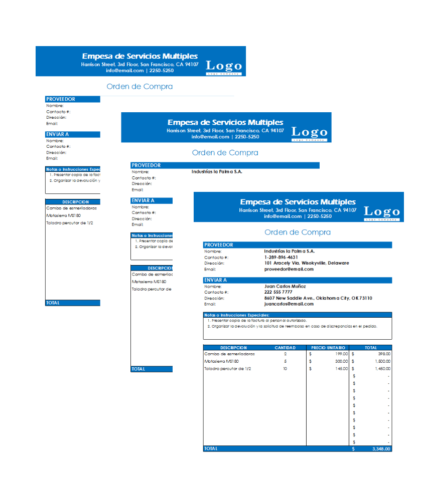 - Eficiencia y Ahorro de Tiempo: La plantilla automatiza cálculos y brinda una estructura predefinida, lo que agiliza la creación de órdenes de compra y reduce el tiempo invertido en tareas administrativas.